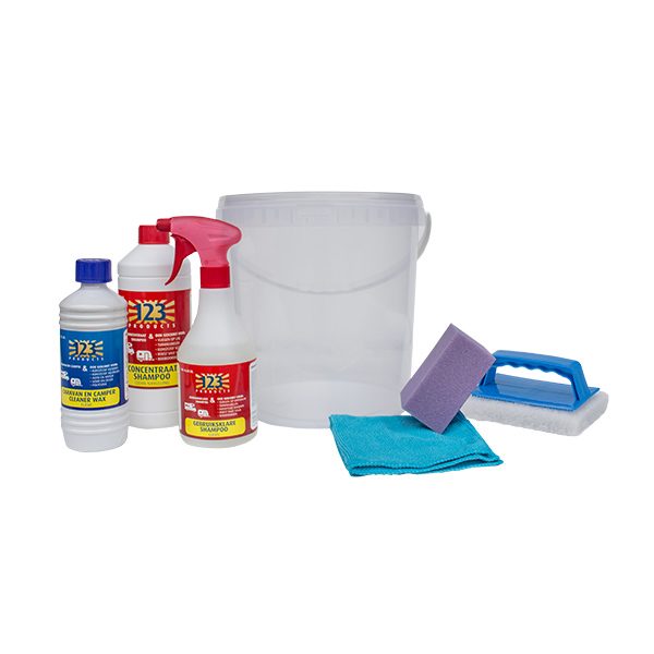 Complete schoonmaakset voor uw caravan of kampeerauto. Inhoud: spuitflacon Clean, 1 liter navulling Clean, 1/2 liter Flash, Jumbo schoonmaakspons, poetsdoeken, scrubby spons, 2x minispons en een opbergemmer.