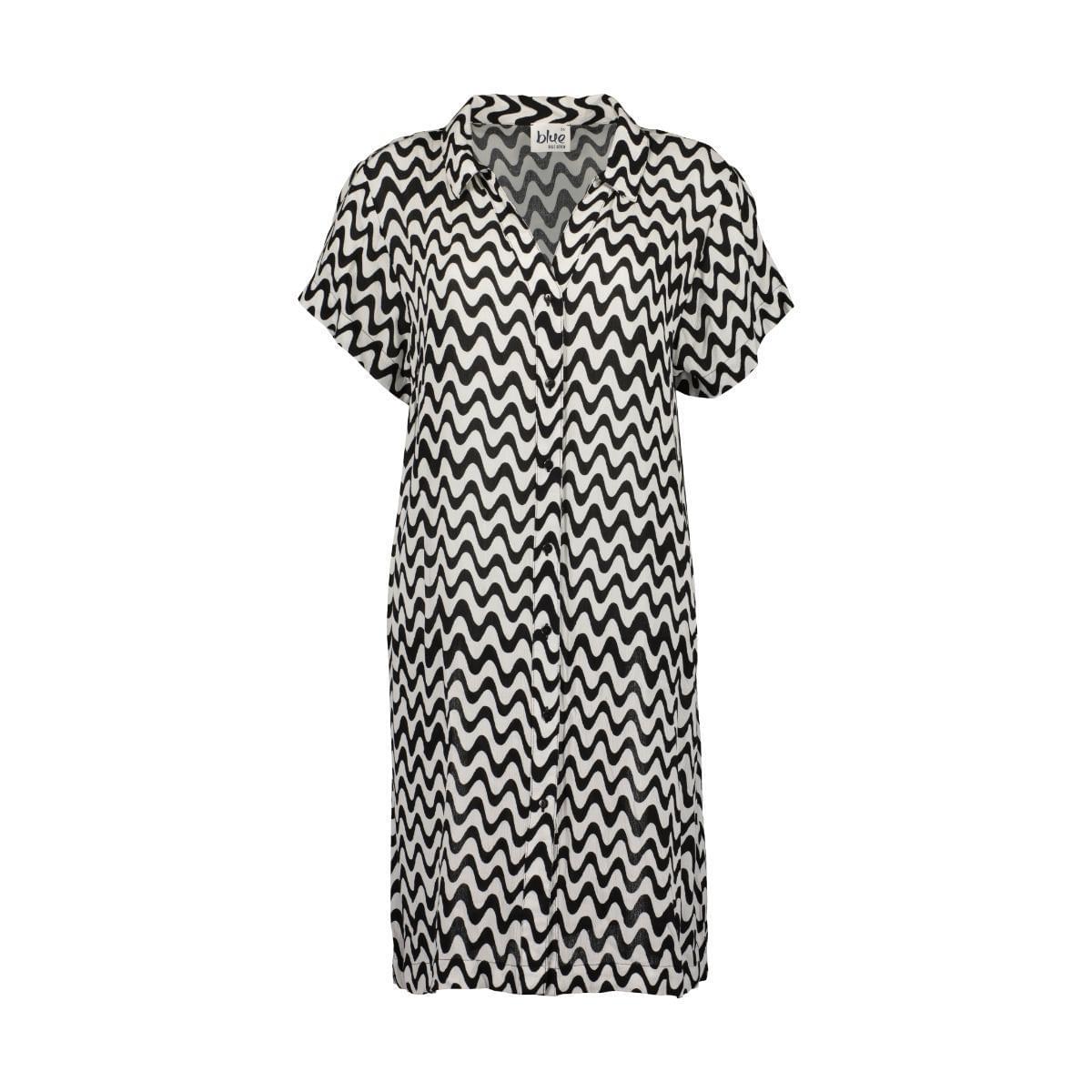Productkenmerken: Materiaal: 100% viscose Polo kraag Korte mouw Knoopsluiting Kreukvrije stof Volledige print De Zig Zag van Blue Seven is een blousejurk in een kreukvrije stof.
