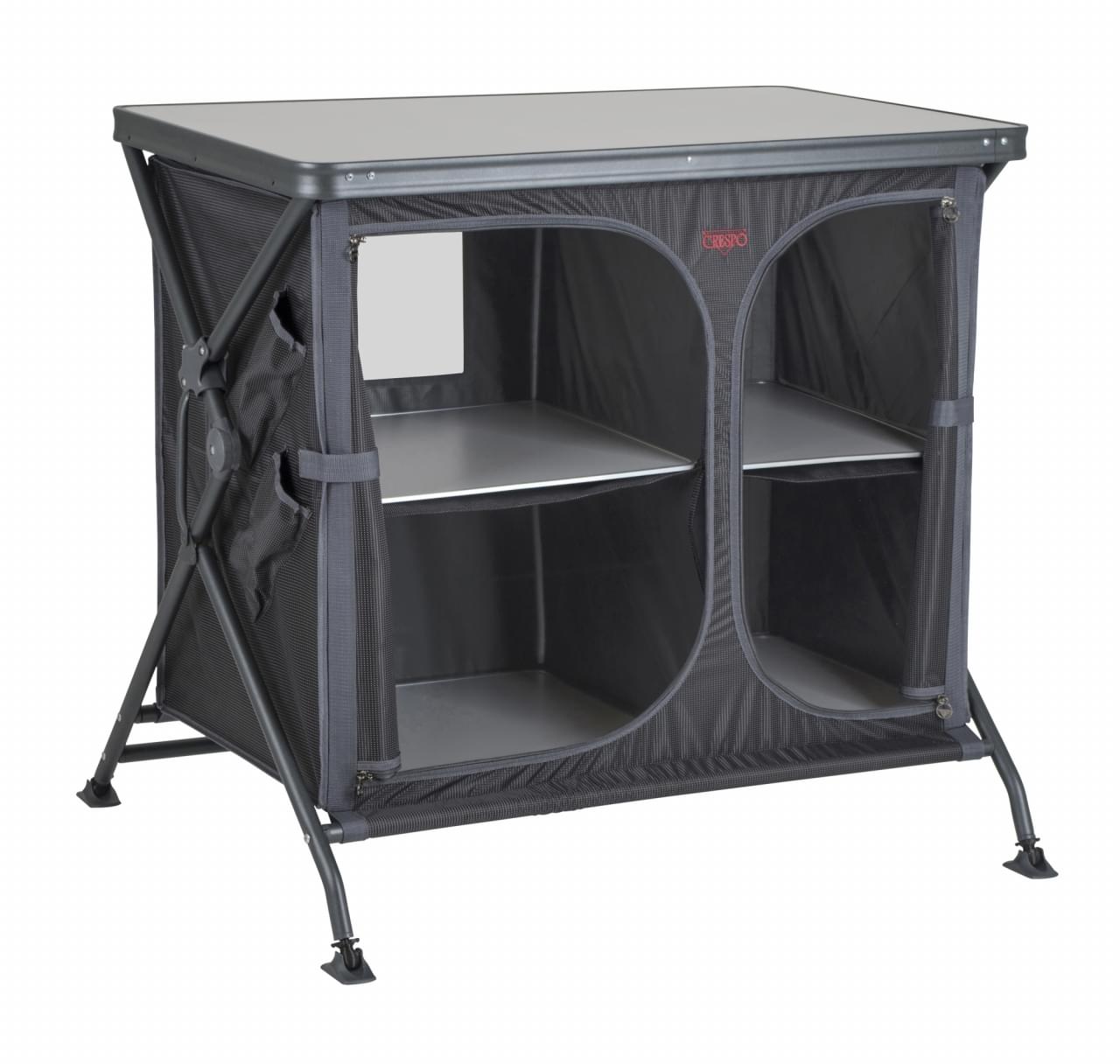 De AP-105 Campingkast van Crespo heeft een uniek systeem om de kast in en uit te klappen. Geen gedoe meer om elke keer de hoes erom heen te moeten trekken, gewoon simpelweg uitklappen. Het aluminium frame is in stijlvol zwart uitgevoerd, passend bij het zwarte doek van de kast. Het kookeiland staat zeer stabiel, zelfs op ongelijke ondergrond, doordat de 4 poten afzonderlijk van elkaar af te