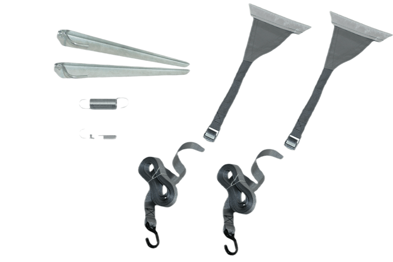 Deze universele bevestigingsset van Haba is geschikt voor verschillende box- en cassetteschermen zoals Thule en Fiamma. De set bestaat uit 2 grote stevige grondpinnen, 2 trekveren, 2 banden met kunststof haak van 4,8 meter en 2 driehoekige riemen die in de voorste kast van de luifel glijden. De riem is 17,5 cm breed en heeft een peesdikte van 6,5 mm.