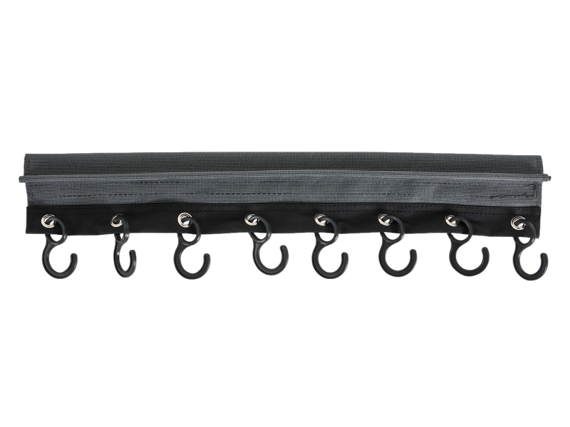 Deze kapstok hang je zó op aan je voortent, luifel of caravanrail – zonder gereedschap. De pees schuif je makkelijk in de caravanrail, het klittenband wikkel je om een nokstok tot 40 mm. Acht stevige haken geven plek aan handdoeken, jassen of keukenspullen. Alles binnen handbereik, niks op de grond. Lengte: 58 cm. Zo blijft je kampeerplek netjes en overzichtelijk.