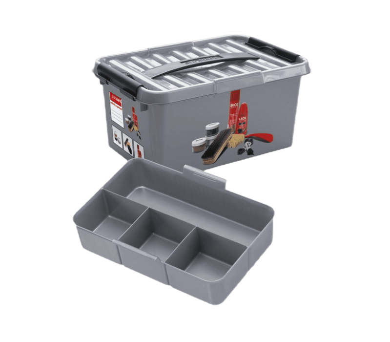 De Sunware Q-line Shoepolish Box 6L zegt het al: een schoenenpoetsdoos. In deze box berg je met gemak al je schoenenmiddeltjes, doekjes en borsteltjes op. De box heeft een inzetbakje met vakverdeling voor kleine spulletjes.
